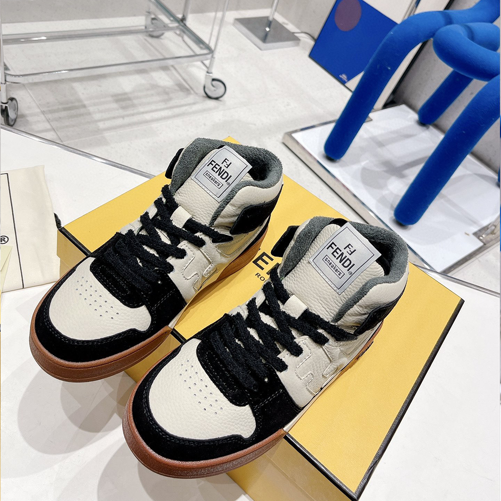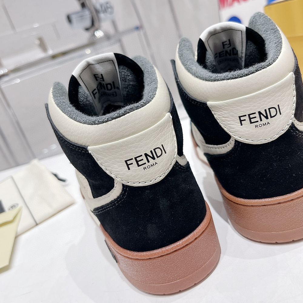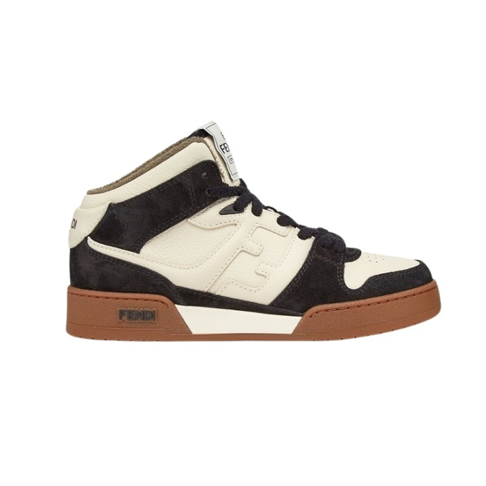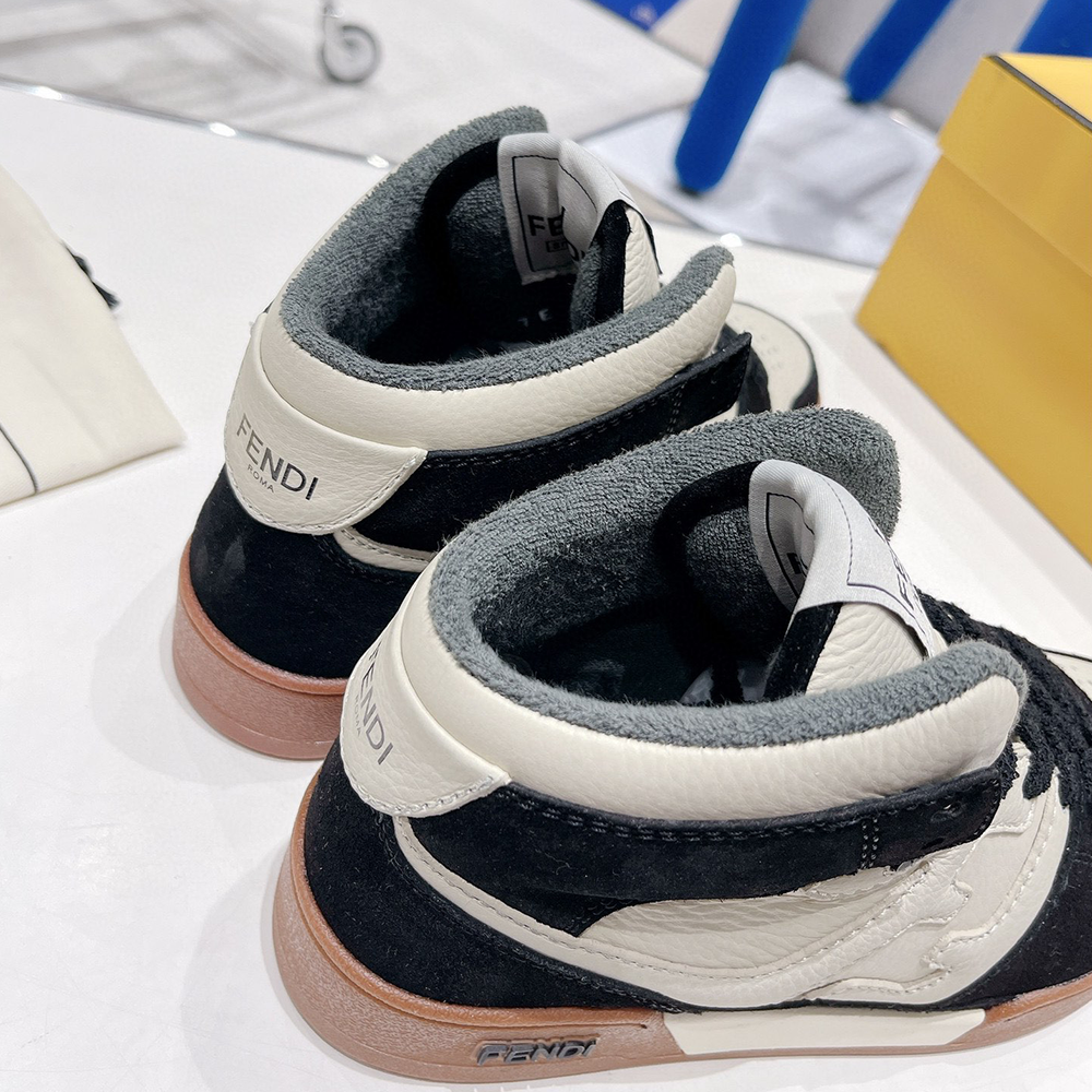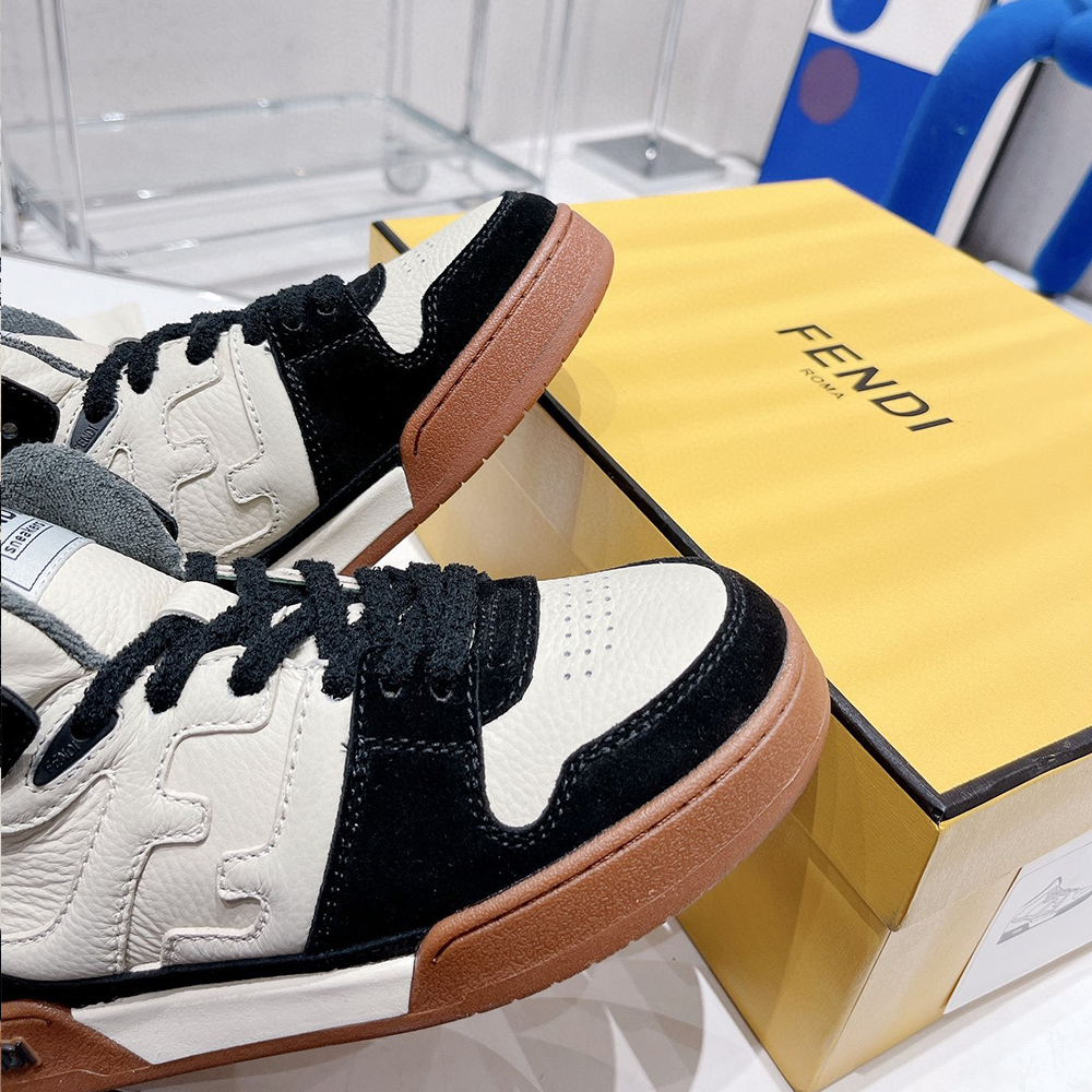 The upper is crafted from a combination of suede and leather, featuring raised double F logos on the sides. The interior is lined with high-density towel fabric, ensuring a comfortable fit.