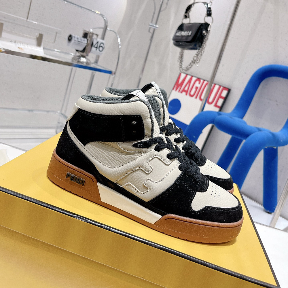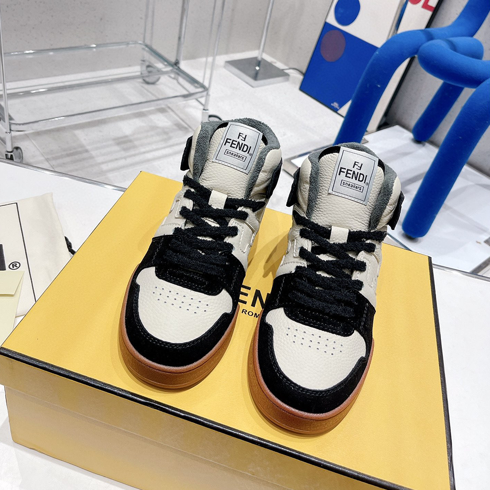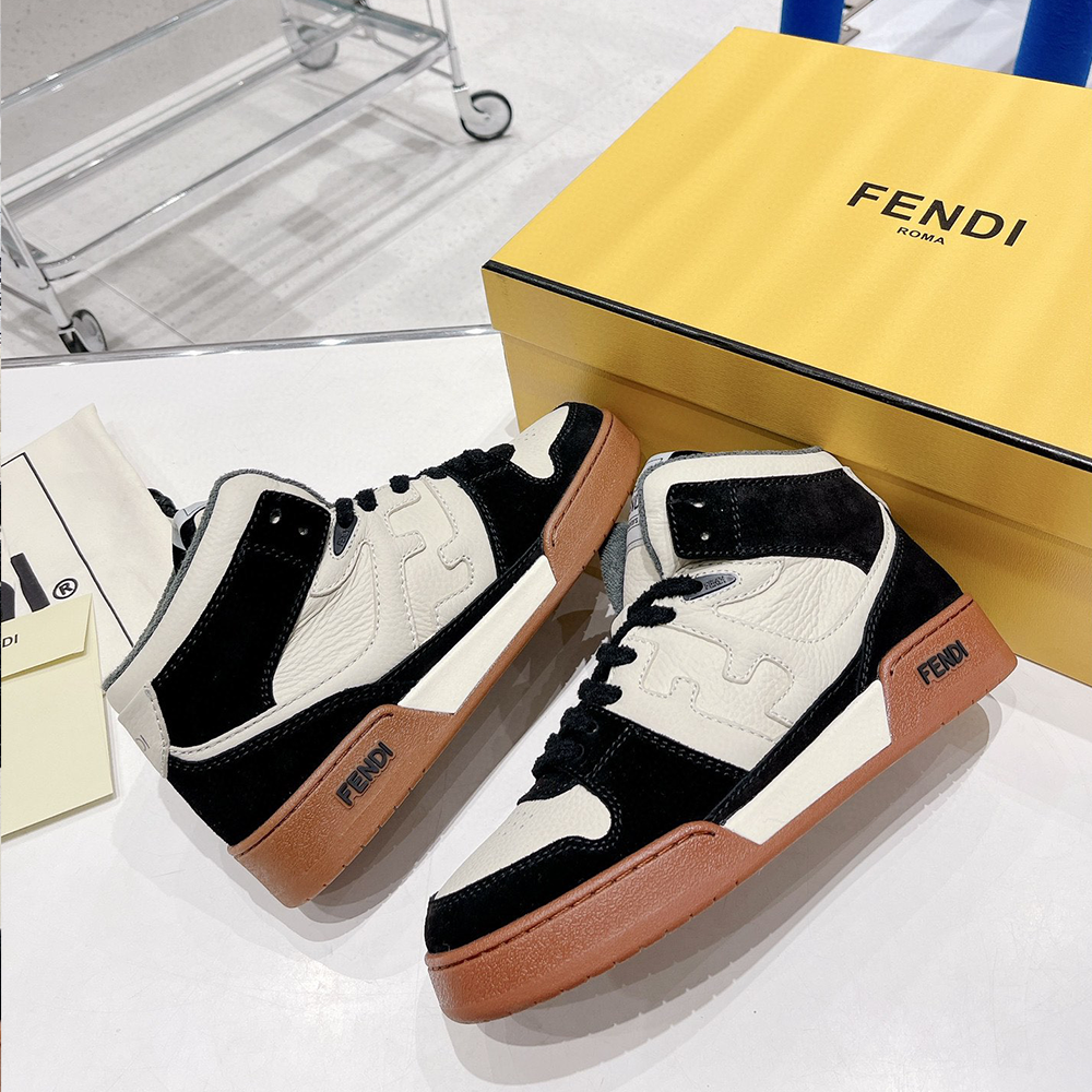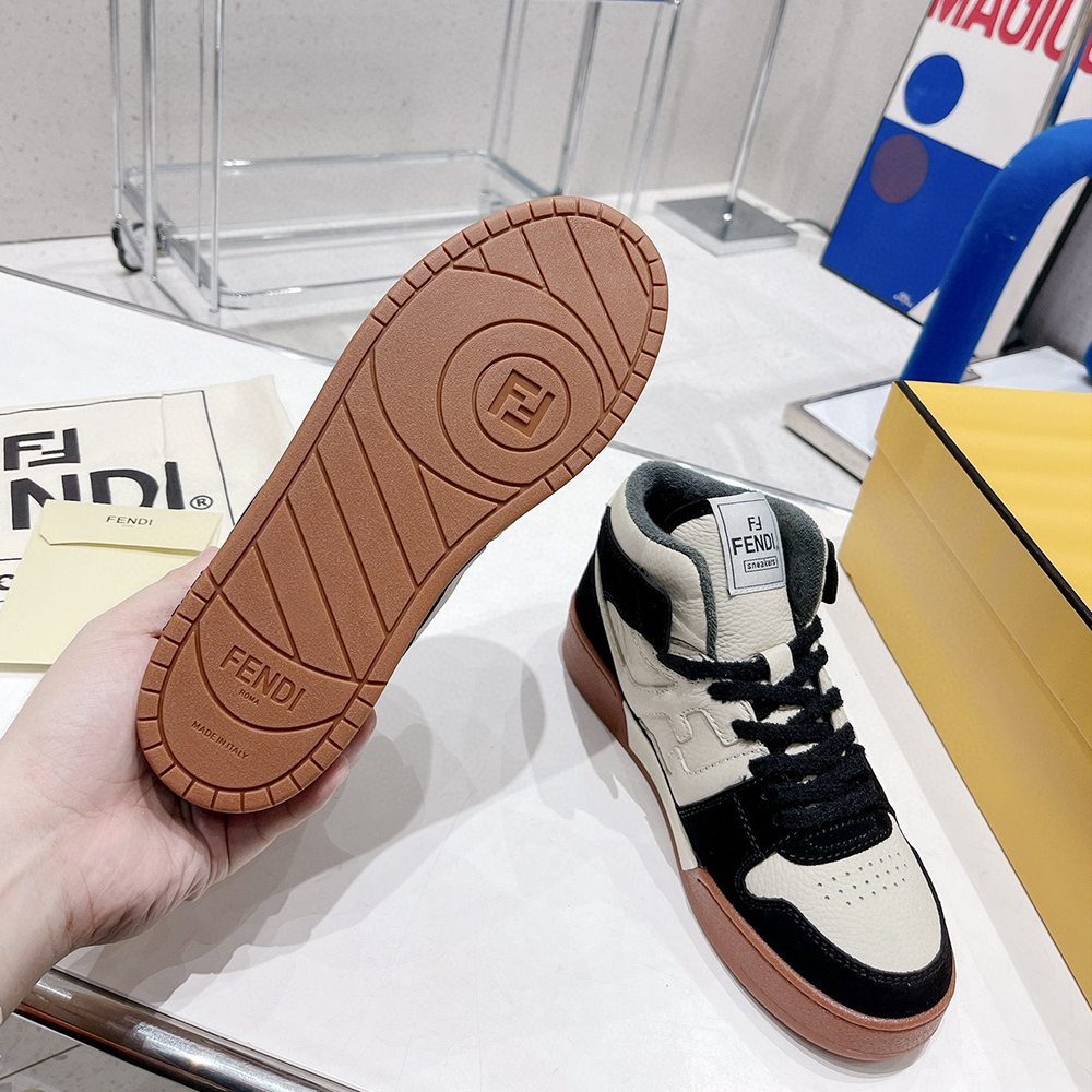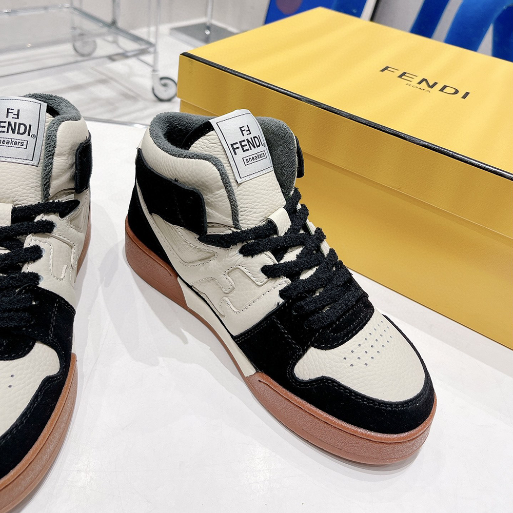 The upper is crafted from a combination of suede and leather, featuring raised double F logos on the sides. The interior is lined with high-density towel fabric, ensuring a comfortable fit.